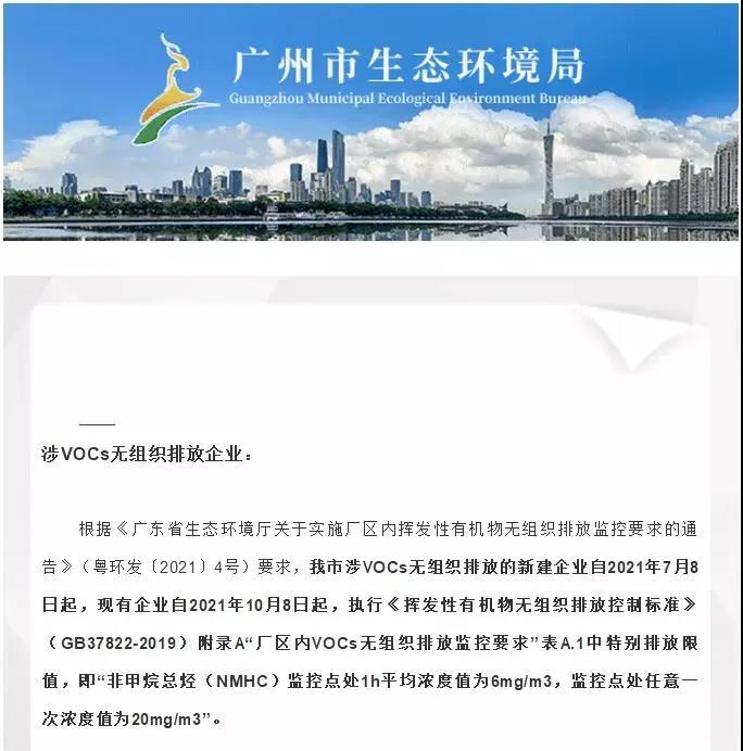 近日了解到:广州生态环境发布一则《致我市涉VOCs无组织排放企业的一封信》,要求涉VOCs无组织排放的新建企业自2021年7月8日起,现有企业自2021年10月8日起,执行《挥发性有机物无组织排放控制标准》(GB37822-2019)附录A“厂区内VOCs无组织排放监控要求”表A.1中特别排放限值,即“非甲烷总烃(NMHC)监控点处1h平均浓度值为6mg/m3,监控点处任意一次浓度值为20mg/m3”。
